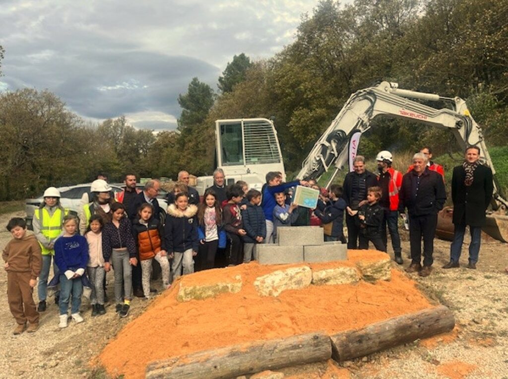 Quelques semaines plus tôt, le 6 novembre 2025, avait lieu la pose de la première pierre de la nouvelle station d’épuration de La Roque-sur-Pernes, en présence d’élus, de techniciens, et d’élèves de l’école de la commune des classes CE2, CM1, et CM2). Cette démarche pédagogique, initiée en 2022, invite les enfants à suivre toutes les étapes du projet : de la visite de l’ancienne station à l’étude des techniques de traitement des eaux, en passant par des jeux en classe sur le cycle de l’eau et la biodiversité. Ainsi, les élèves passent de spectateurs, à acteurs d’un projet concret et utile à tous.