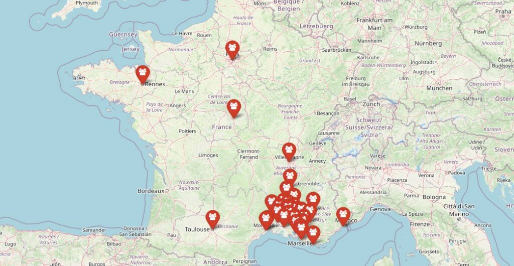*Aix-en-Provence, Alpilles, Apt, Arles, Bagnols-sur-Cèze, Baronnies-Ventoux, Bourges, Carpentras, Grand Avignon, Lyon, Luberon, Manosque, Marseille-Centre, Marseille-Nord, Montélimar, Montpellier-Nord, Nice, Nîmes-Métropole, Orange, Paris, Pertuis, Rennes, Saint-Jean-De-Védas, Salon-de-Provence, Sisteron, Toulon, Toulouse, Uzès, Valence, Vedène et Villeneuve-Les Angles.